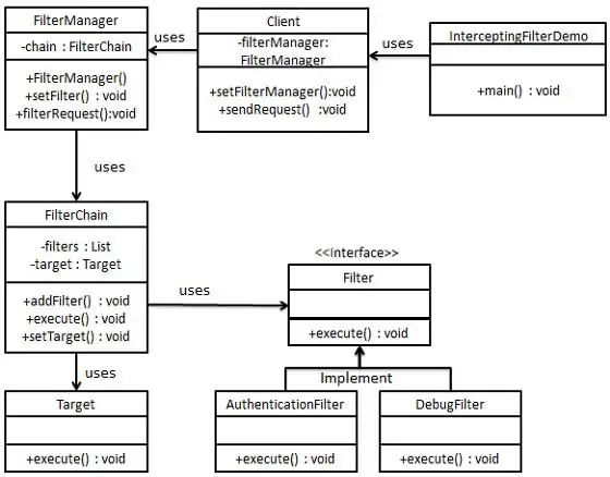 我们将创建 FilterChain、FilterManager、Target、Client 作为表示实体的各种对象。AuthenticationFilter 和 DebugFilter 表示实体过滤器。