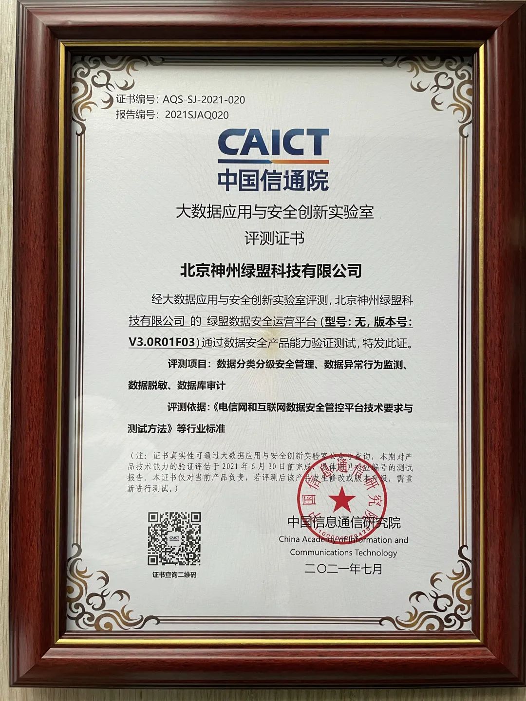 7月14日,中国信息通信研究院(以下简称“中国信通院”)颁发“卓信大数据计划”-数据安全类产品能力验证测试证书。绿盟数据安全运营平台顺利通过数据分类分级安全管理、数据异常行为监测、数据脱敏、数据库审计四项功能评测,获得评测证书。
