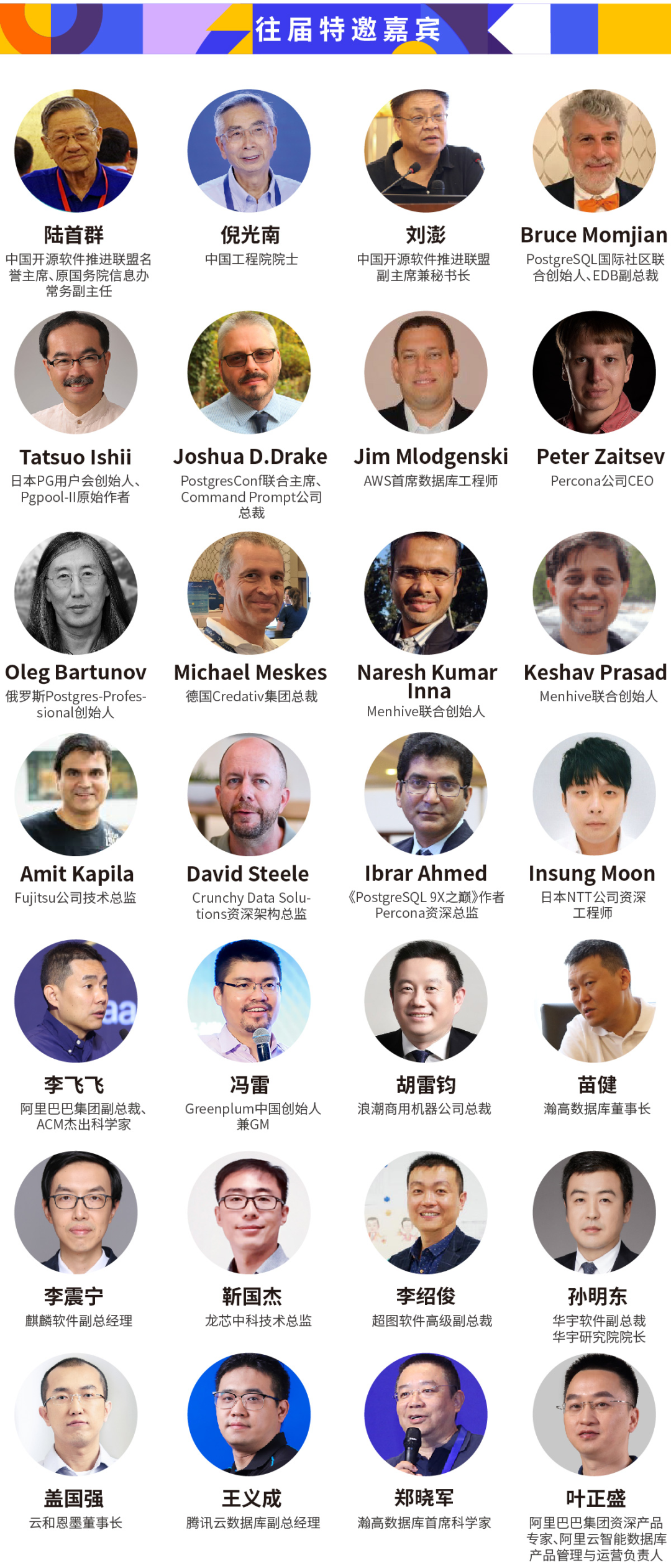 除中国演讲者外,本届大会将继续集结来自美国PG社区、欧洲PG社区、俄罗斯PG社区、日本PG社区、韩国PG社区、印度PG社区、泰国PG社区、印尼PG社区等核心布道者的主题演讲。您不仅可以用最快的方式领略PostgreSQL在全球的最新趋势与开发动态,还能深入体会其繁荣的全球化生态。