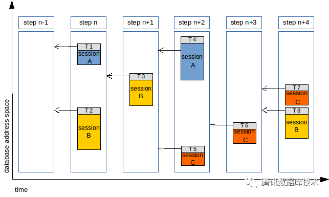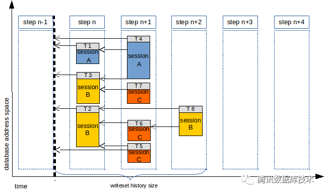 图中每一个方块代表一个事务,方块对应的区域代表事务影响的范围,如果有重叠则表示事务有冲突,每一个step代表一次组提交,T1-T8代表事务的执行顺序。如果不使用WriteSet,在slave上回放的时候的顺序: