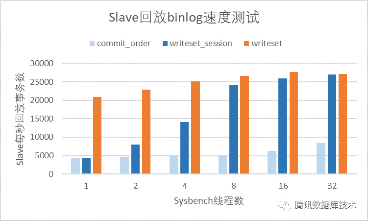 可以看到,基于writeset的复制比基于commit_order的复制会快很多;当master并发度较低的时候,基于writeset_session的复制也会较慢,但比commit_order快;当并发度较高的时候writeset_session和writeset的复制速度比较接近,总体上writeset_session的速度要低于writeset。
