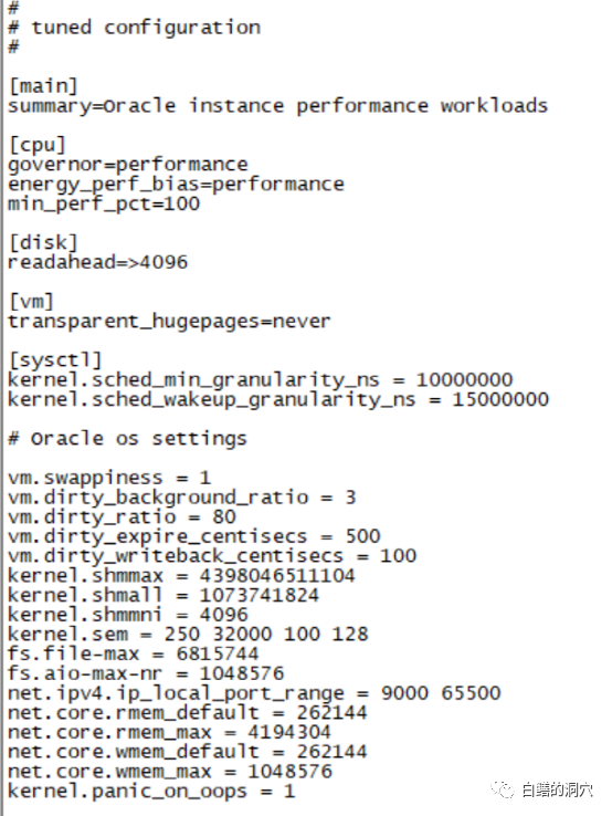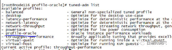 其中包含了Ms SqlServer和Oracle的模板。我的测试环境中的tuned是2.0.8的,无法安装这些模板。于是我根据以前积累的一些Oracle和PG的OS优化经验,自己来创建两个模板。要创建tuned 模板,实际上我们可以利用现有的模板来进行改造。最好的标准模板是throughput-performance,这个模板的目的是让服务器拥有最大的吞吐能力。