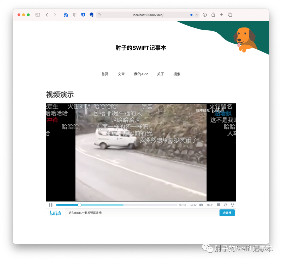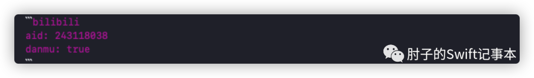 /*每个modifier对应一个markdown语法类型。目前支持的类型有: metadataKeys,metadataValues,blockquotes,codeBlocks,headingshorizontalLines,html,images,inlineCode,links,lists,paragraphs,tables*/var bilibili = Modifier(target: .codeBlocks) { html, markdown in// html为Ink默认的HTML转换结果,markdown为该target对应的原始内容// firstSubstring是Publish套件中的Sweep提供的快速配对方法.guard let content = markdown.firstSubstring(between: .prefix("```bilibili\n"), and: "\n```") else {return html}var aid: String = ""var danmu: Int = 1// scan也是Sweep中提供另一种配对获取方式,下面的代码是获取aid:和换行之间的内容content.scan(using: [Matcher(identifier: "aid: ", terminator: "\n", allowMultipleMatches: false) { match, _ inaid = String(match)},Matcher(identifiers: ["danmu: "], terminators: ["\n", .end], allowMultipleMatches: false) {match,_ indanmu = match == "true" ? 1 : 0},])//modifier的返回值为HTML代码,本例中我们不需要使用Ink的默认转换,直接全部重写//在很多的情况下,我们可能只是在默认转换的html结果上做出一定的修改即可return"""<div style="position: relative; padding: 30% 45% ; margin-top:20px;margin-bottom:20px"><iframe style="position: absolute; width: 100%; height: 100%; left: 0; top: 0;" src="https://player.bilibili.com/player.html?aid=\(aid)&page=1&as_wide=1&high_quality=1&danmaku=\(danmu)" frameborder="no" scrolling="no"></iframe></div>"""}