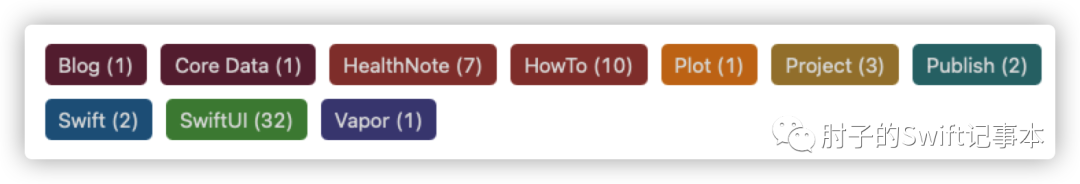 .forEach(page.tags.sorted()) { tag in.li(.class(tag.colorfiedClass), //tag.colorfieldClass 也是通过相同手段增加的属性,在文章最后会有该插件的获取地址.a(.href(context.site.path(for: tag)),.text("\(tag.string) (\(tag.count))")))}