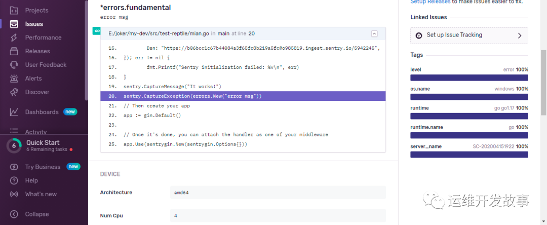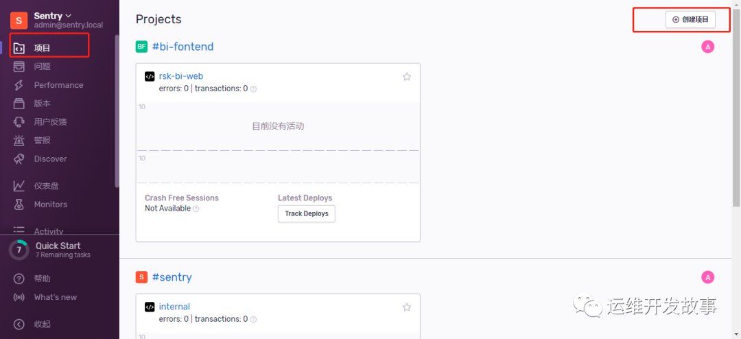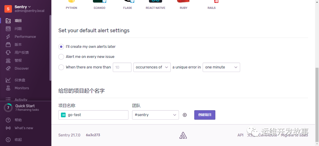 在Sentry WEB UI界面创建项目 生成对应的Dsn 将其引入到具体的应用代码中