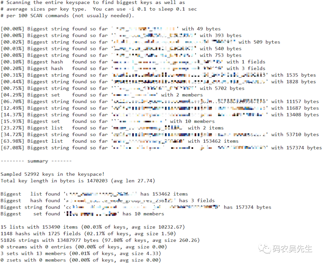 是 redis 自带的命令,对整个 Key 进行扫描,统计 string,list,set,zset,hash 这几个常见数据类型中每种类型里的最大的 key。string 类型统计的是value 的字节数;另外 4 种复杂结构的类型统计的是元素个数,不能直观的看出 value 占用字节数,所以 --bigkeys