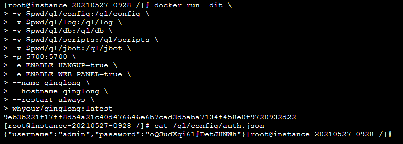 docker run -dit \-v $pwd/ql/config:/ql/config \-v $pwd/ql/log:/ql/log-v $pwd/ql/db:/ql/db \v $pwd/ql/scripts:/ql/scripts \-p 5700:5700 \-e ENABLE_HANGUP=true \-e ENABLE_WEB_PANEL=true \--name qinglong \--hostname qinglong \--restart always \whyour/qinglong:latest