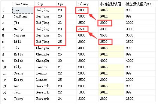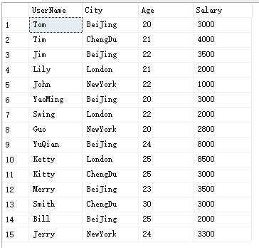 CREATE TABLE Temp_Test (UserName VARCHAR(20),City VARCHAR(20),Age INT,Salary INT)INSERT INTO Temp_Test(UserName,City,Age,Salary) VALUES('Tom','BeiJing',20,3000);INSERT INTO Temp_Test(UserName,City,Age,Salary) VALUES('Tim','ChengDu',21,4000);INSERT INTO Temp_Test(UserName,City,Age,Salary) VALUES('Jim','BeiJing',22,3500);INSERT INTO Temp_Test(UserName,City,Age,Salary) VALUES('Lily','London',21,2000);INSERT INTO Temp_Test(UserName,City,Age,Salary) VALUES('John','NewYork',22,1000);INSERT INTO Temp_Test(UserName,City,Age,Salary) VALUES('YaoMing','BeiJing',20,3000);INSERT INTO Temp_Test(UserName,City,Age,Salary) VALUES('Swing','London',22,2000);INSERT INTO Temp_Test(UserName,City,Age,Salary) VALUES('Guo','NewYork',20,2800);INSERT INTO Temp_Test(UserName,City,Age,Salary) VALUES('YuQian','BeiJing',24,8000);INSERT INTO Temp_Test(UserName,City,Age,Salary) VALUES('Ketty','London',25,8500);INSERT INTO Temp_Test(UserName,City,Age,Salary) VALUES('Kitty','ChengDu',25,3000);INSERT INTO Temp_Test(UserName,City,Age,Salary) VALUES('Merry','BeiJing',23,3500);INSERT INTO Temp_Test(UserName,City,Age,Salary) VALUES('Smith','ChengDu',30,3000);INSERT INTO Temp_Test(UserName,City,Age,Salary) VALUES('Bill','BeiJing',25,2000);INSERT INTO Temp_Test(UserName,City,Age,Salary) VALUES('Jerry','NewYork',24,3300);