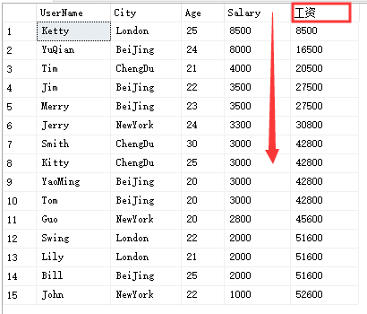 select UserName,City,Age,Salary,sum(Salary) over(order by Salary desc) '工资'from Temp_Test
