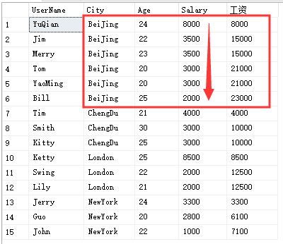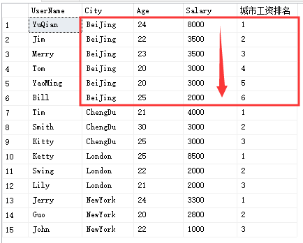 select UserName,City,Age,Salary,ROW_NUMBER() over(partition by City order by Salary desc) '城市工资排名'from Temp_Test