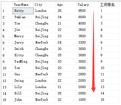 select UserName,City,Age,Salary,ROW_NUMBER() over(order by Salary desc) '工资排名'from Temp_Test
