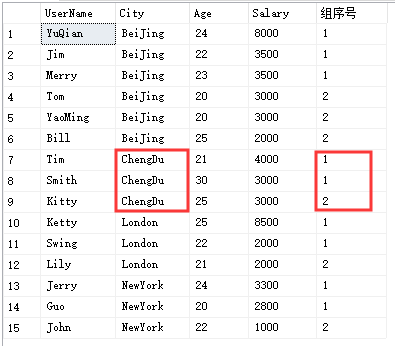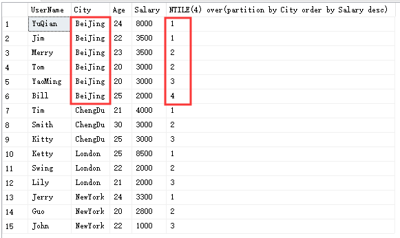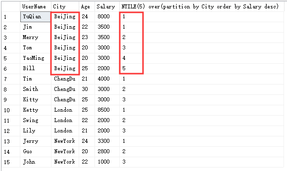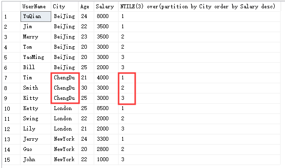 select UserName,City,Age,Salary,NTILE(2) over(partition by City order by Salary desc) '组序号'from Temp_Test
