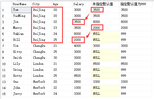 select UserName,City,Age,Salary,LAG(Salary,2) over(partition by City order by Age) '未指定默认值',LAG(Salary,2,999) over(partition by City order by Age) '指定默认值为999'from Temp_Test