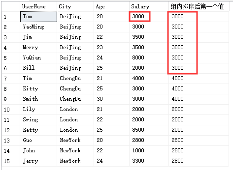 select UserName,City,Age,Salary,FIRST_VALUE(Salary) over(partition by City order by Age) '组内排序后第一个值'from Temp_Test