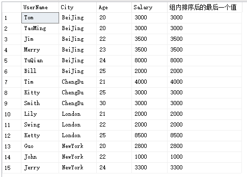 select UserName,City,Age,Salary,FIRST_VALUE(Salary) over(partition by City order by Age DESC) '组内排序后的最后一个值'from Temp_TestORDER BY City,Age