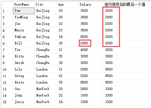 select UserName,City,Age,Salary,LAST_VALUE(Salary) over(partition by City order by Age) '组内排序后的最后一个值'from Temp_Test