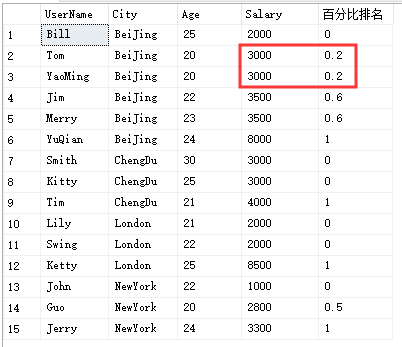 select UserName,City,Age,Salary,PERCENT_RANK() over(partition by City order by Salary) '百分比排名'from Temp_Test