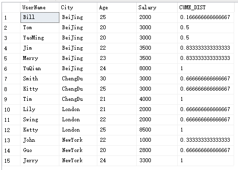 select UserName,City,Age,Salary,CUME_DIST() over(partition by City order by Salary) 'CUME_DIST'from Temp_Test