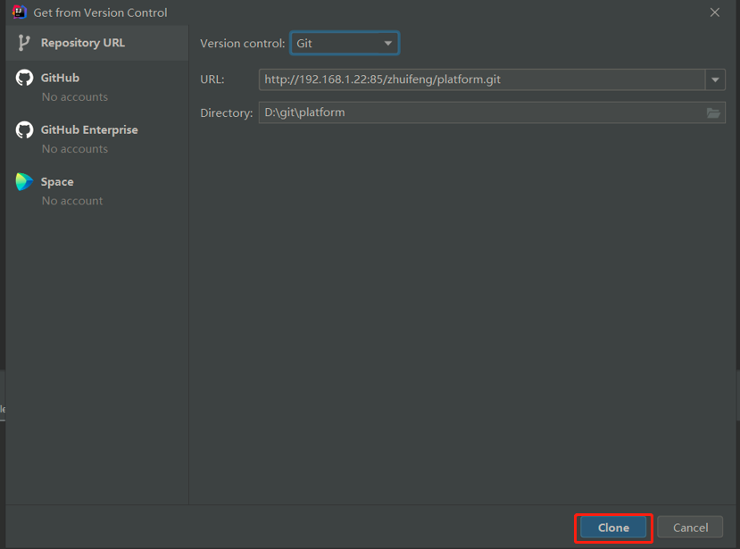 在弹出的对话框中,填写Git地址,点击【Clone】按钮即可从Git中克隆项目