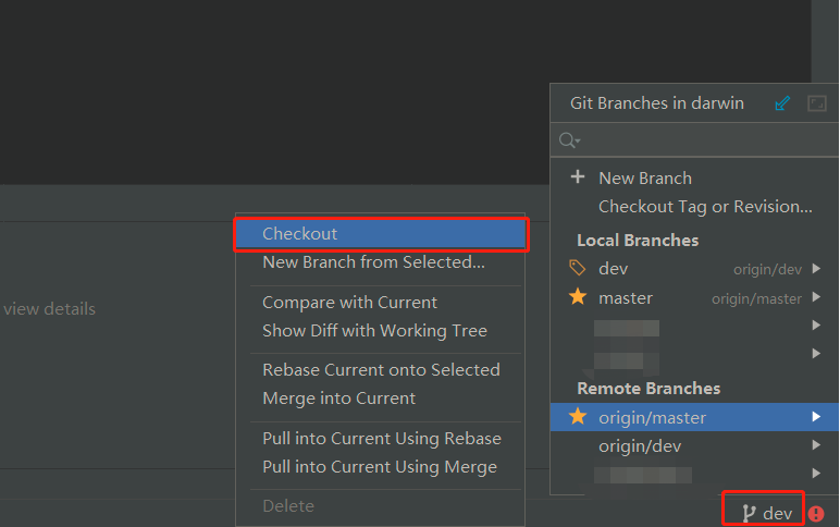 切换分支很容易,当项目被克隆到IDEA后,在IDEA的右下角会有一个分支标识,点击分支标识,会显示Git分支菜单,此时点击想要切换的分支,选择 Checkout 选项即可。