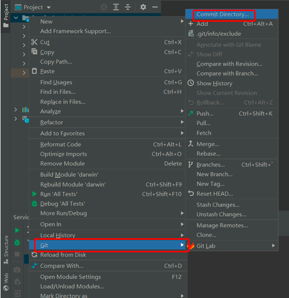 在修改的文件或项目上点击鼠标右键,在弹出的菜单里选择 Git —> Commit Directory…,然后填写提交备注,将代码commit。