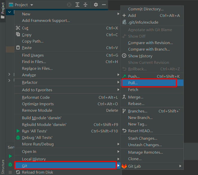 项目上点击鼠标右键,在弹出的菜单里选择 Git —>Pull…,即可拉取代码,在拉取时,可能会出现代码冲突,根据提示解决冲突即可。