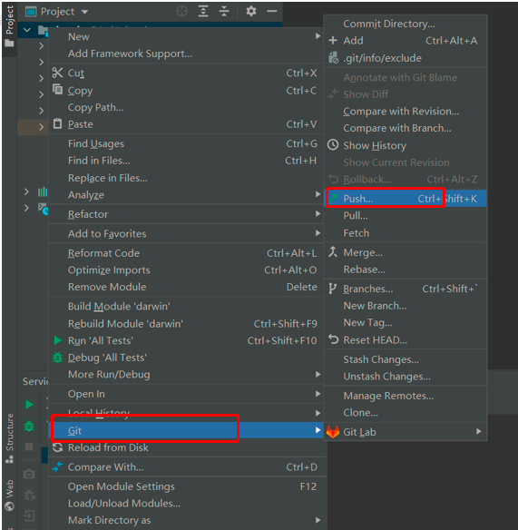 项目上点击鼠标右键,在弹出的菜单里选择 Git —>Push…即可