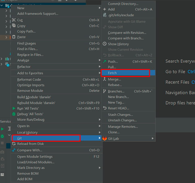 项目上点击鼠标右键,在弹出的菜单里选择 Git —>Fetch 即可