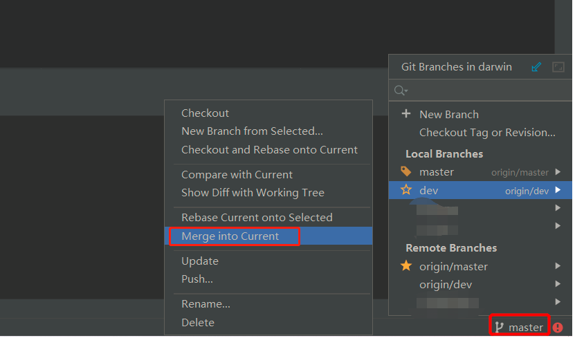 2)然后选择新开发的代码所在的分支,例如:dev分支,选择 dev —>Merge into Current 选项,解决冲突即可。