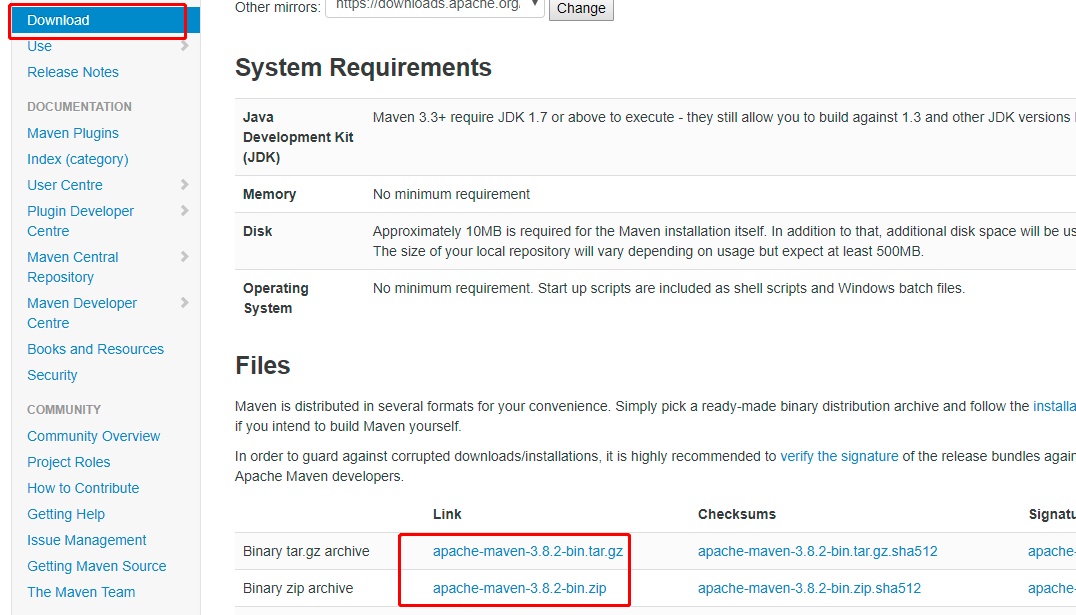在Maven官网(https://maven.apache.org/download.cgi)可以下载到Maven的最新的版本和历史的版本。