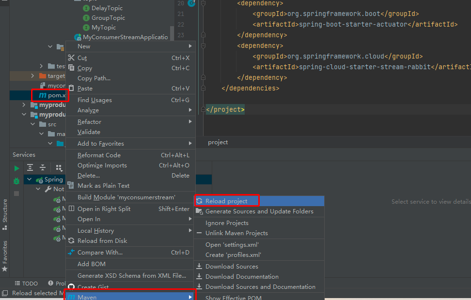 在pom文件中添加依赖后,在pom文件上点击鼠标右键,在右键菜单中选择 Maven—> Reload project ,IDEA便会自动下载相应的jar包。