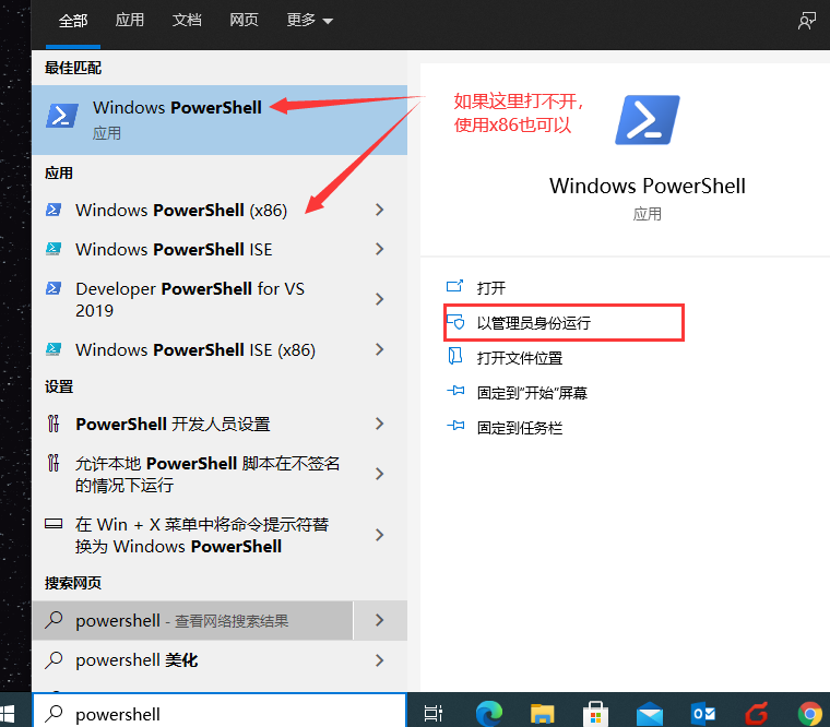 以管理员身份运行PowerShell,如果运行失败,运行x86的版本也可以。