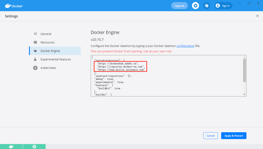 {"registry-mirrors": ["https://dockerhub.azk8s.cn","https://registry.docker-cn.com","https://xxx.mirror.aliyuncs.com"],"insecure-registries": [],"debug": true,"experimental": true,"features": {"buildkit": true},"builder": {"gc": {"enabled": true,"defaultKeepStorage": "20GB"}}}