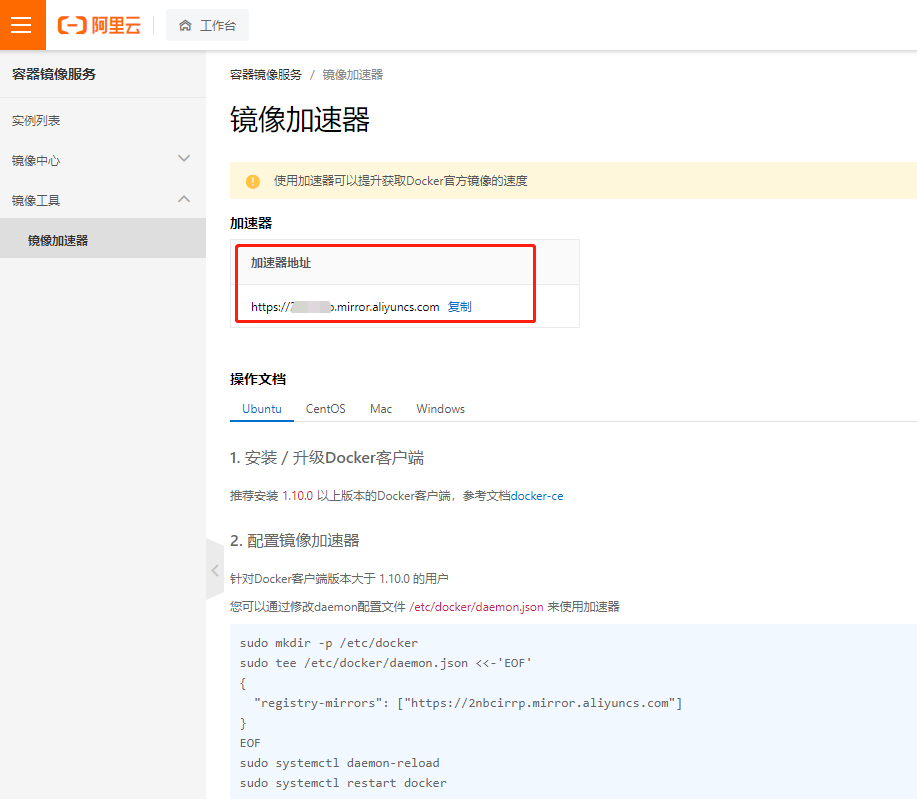 https://xxx.mirror.aliyuncs.com是阿里云镜像,查看阿里云的镜像加速器地址,https://cr.console.aliyun.com/cn-hangzhou/instances/mirrors,