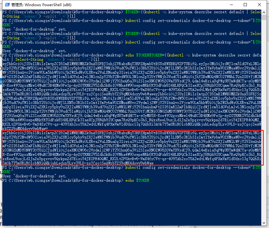$TOKEN=((kubectl -n kube-system describe secret default | Select-String "token:") -split " +")[1]kubectl config set-credentials docker-for-desktop --token="${TOKEN}"echo $TOKEN