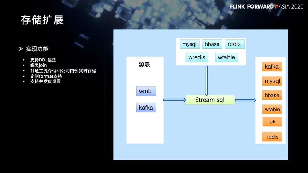 第一,打通了主流存储和内部的实时存储。比如说,在源表上支持了内部的 wmb,它是一个分布式消息队列。在维表上支持这种 redis,内部的 wtable。在结果表上支持了 ClickHouse,redis,以及我们内部的 wtable;