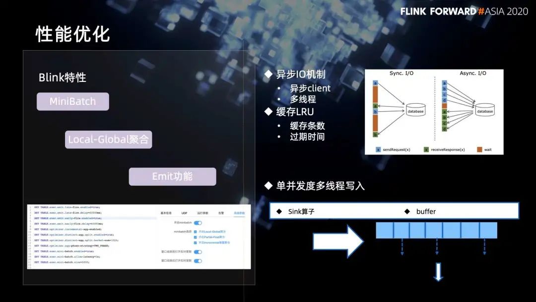 同样,数据写入这一块遇到大并发量写入的时候,尽量提高并发来解决写入性的问题,这样就会导致整个任务的 CPU 利用率比较低,所以就采用单并发度多线程的写入机制,它的实现是在 sink 算子里面增加一个 buffer,数据流入到 sink 之后会首先写入到 buffer,然后会启动多线程机制去消费这个 buffer,最终写到存储里面。