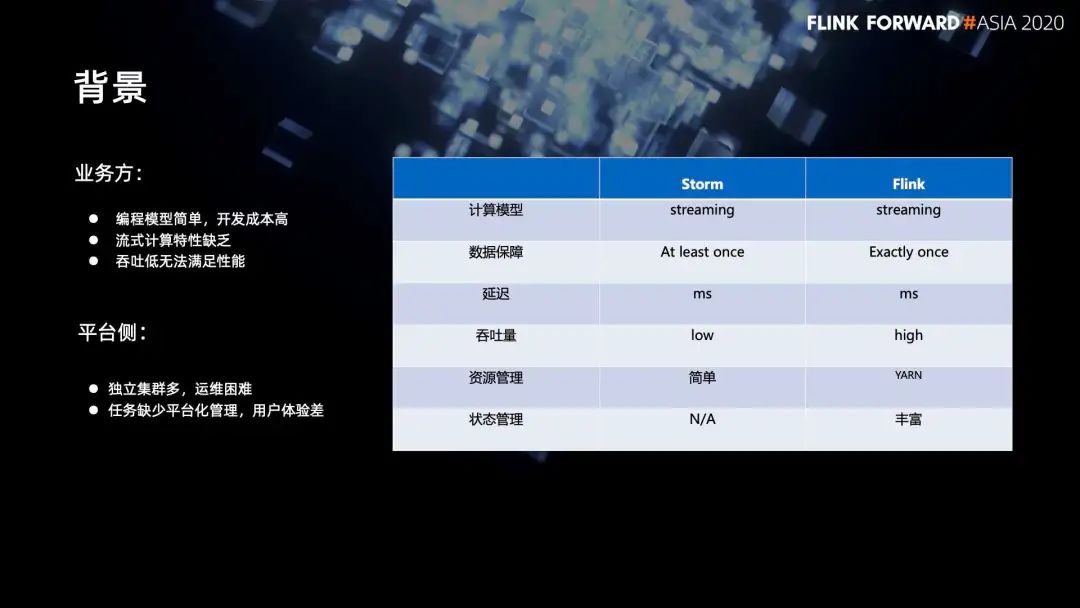 而 Storm 对用户来说,编程模型简单,开发成本高,流式计算特性缺乏,吞吐低无法满足性能。在平台侧,独立集群多、运维困难、任务缺少平台化管理、用户体验差。