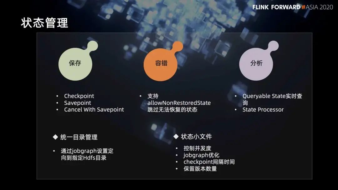 在分析方面,支持 Queryable State 实时查询,基于离线的 State Processor 的分析方式,我们会帮用户把这个状态下载进行分析。