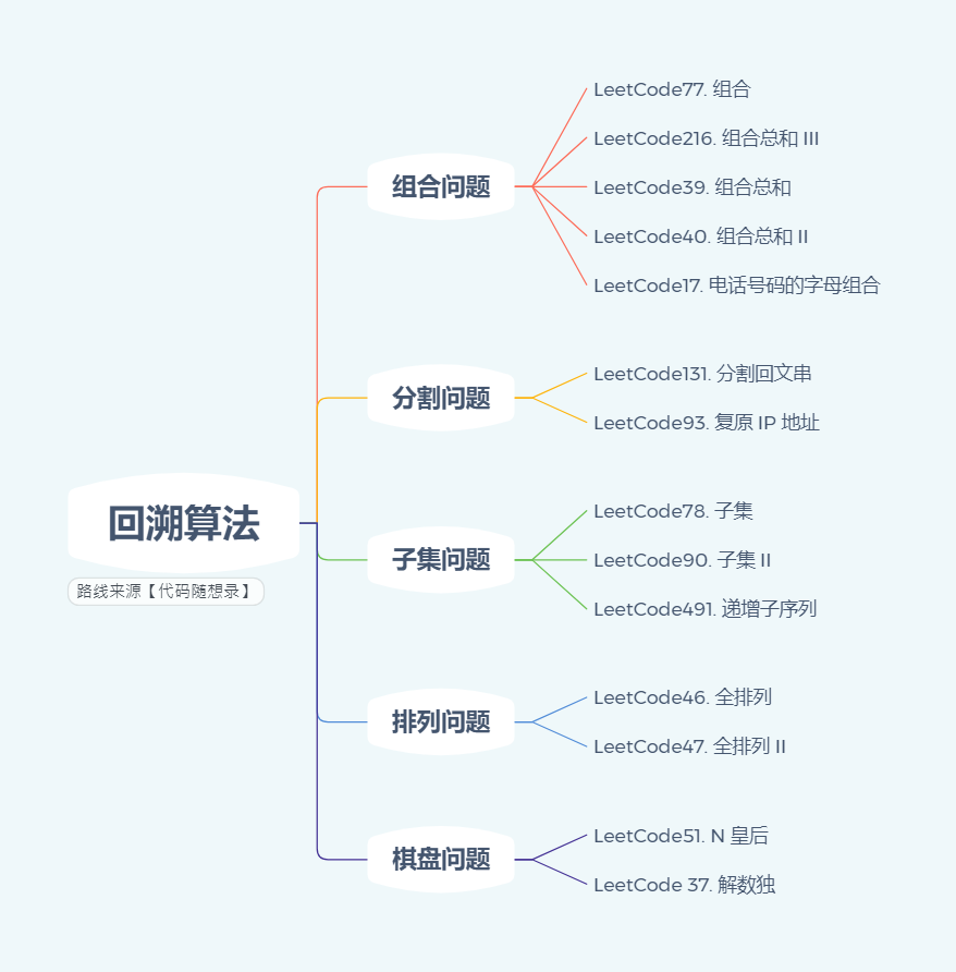 组合问题:N个数里面按一定规则找出k个数的集合 切割问题:一个字符串按一定规则有几种切割方式 子集问题:一个N个数的集合里有多少符合条件的子集 排列问题:N个数按一定规则全排列,有几种排列方式 棋盘问题:N皇后,解数独等等
