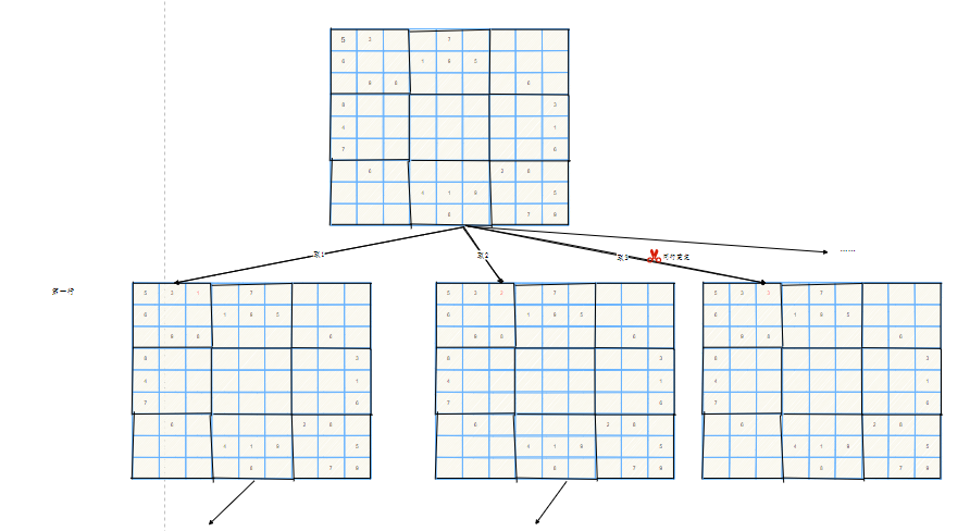 需要一个两个循环套着的递归,一个循环棋盘的行,一个循环棋盘的列,递归遍历这个位置放9个数字的可能。