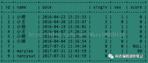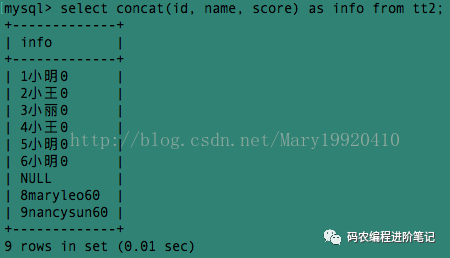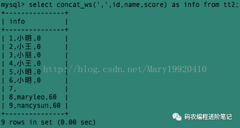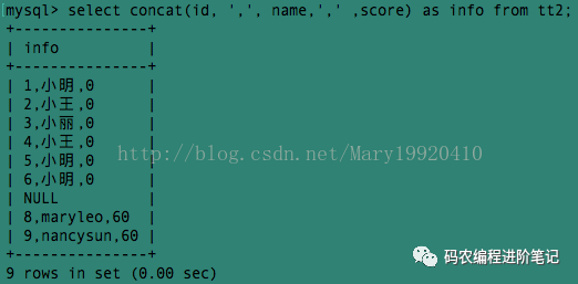 例2:在例1的结果中三个字段id,name,score的组合没有分隔符,我们可以加一个逗号作为分隔符:
