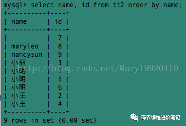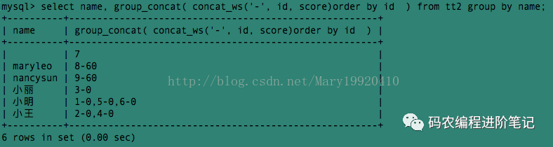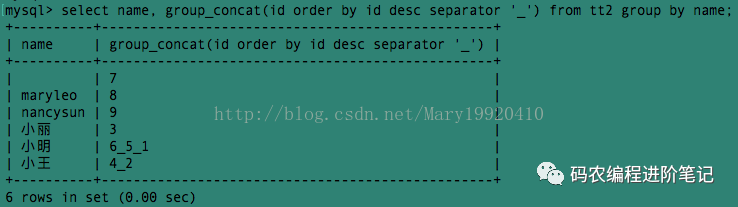 说明:通过使用distinct可以排除重复值;如果希望对结果中的值进行排序,可以使用order by子句;separator是一个字符串值,缺省为一个逗号。
