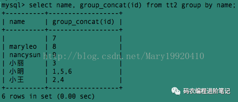 例7:使用group_concat()和group by显示相同名字的人的id号: