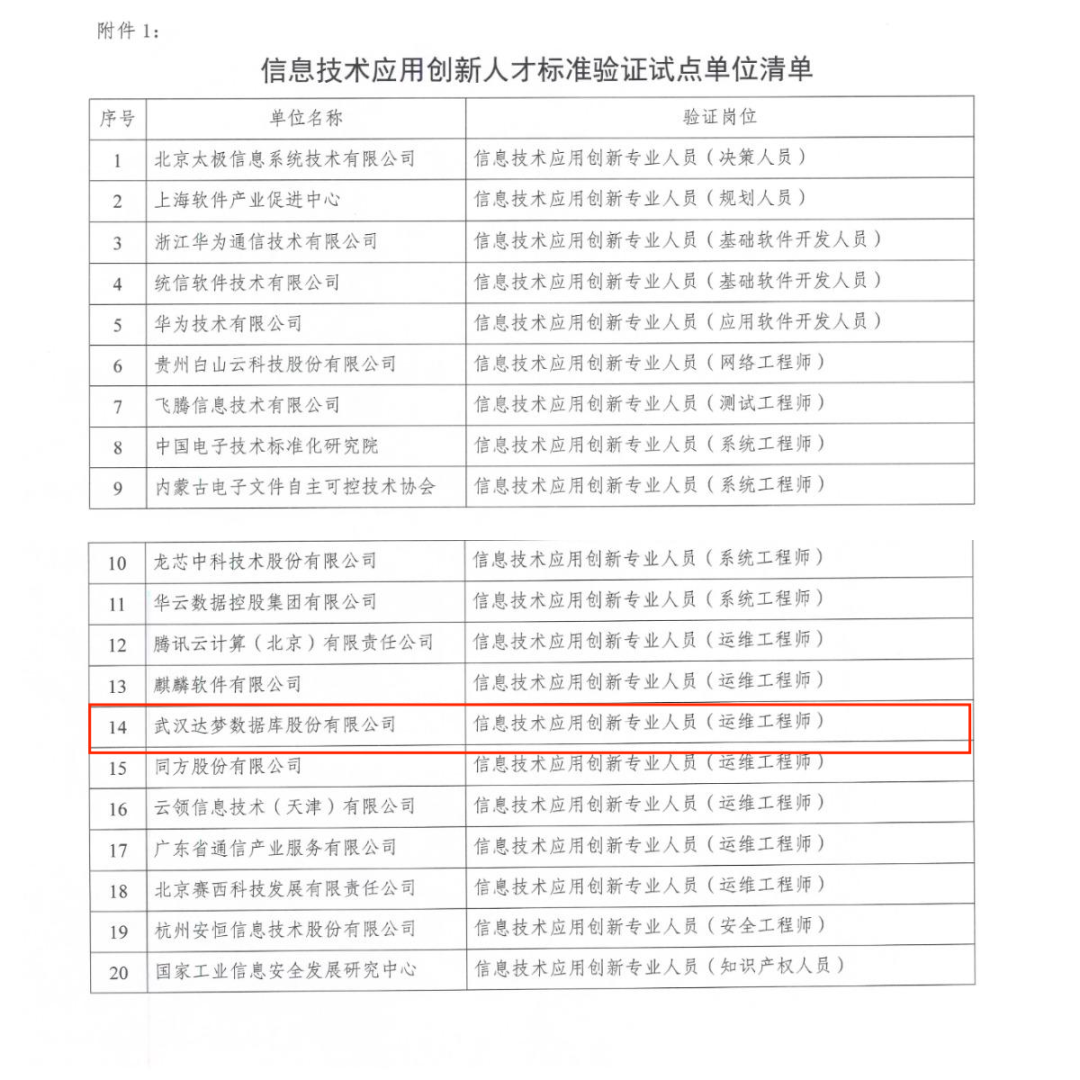 武汉达梦数据库股份有限公司作为《信息技术应用创新 专业人员能力要求》团体标准参编单位之一,积极参与行业、团体等相关人才培养标准参编及试点工作,经专家评审,成功成为信息技术应用创新人才标准验证试点单位。