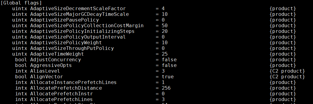 \\运行下面的shell命令,可以输出不重复的Application值,加上注释,方便查看含义cat jvm_flag_final.txt | awk -F '\\{' '{if(NR!=1) {print "\{"$2}}' | sort | uniq{ARCH product}{C1 pd product}{C1 product}{C2 pd product}{C2 product}{lp64_product}{manageable}{pd product}{product rw}{product}