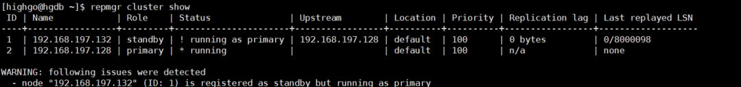 故障模拟(repmgrd进程正在运行中):主库 192.168.197.128备库 192.168.197.132停掉主库:pg_ctl stop -mf等待一分钟后,启动主库,检查集群状态:此时集群状态出现异常:
