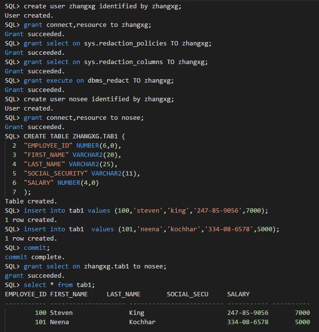 本次只模拟几种常用加密场景,创建用户、表,并赋予相应权限;若无特殊说明时,调用DBMS_REDACT所使用的均为zhangxg用户。