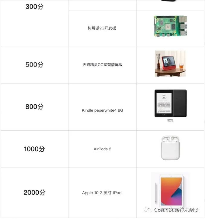 OceanBase 开源团队为了吸引开发者参与这个大赛,对参与者也提供了很丰富的奖励和奖金。只要参与提交代码,就会获得社区积分,可以兑换一些开发者喜欢的礼品(后面详述)。这里针对大赛最终获奖选手,给出了丰厚的奖金激励。