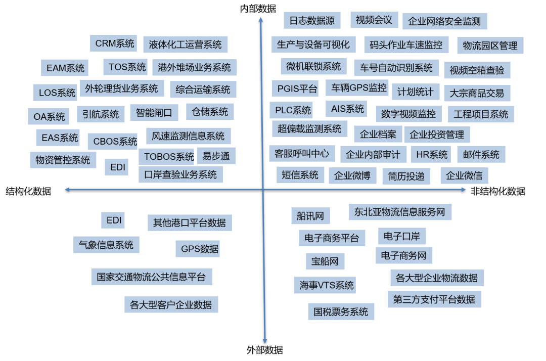 三、从【数据域】的角度看,港口的数据分为内部和外部数据,结构化和非结构化数据。结构化数据有:集装箱码头管理TOS系统、电子信息EDI系统、生产业务协同管理CBOS系统、财务系统等,这块也是数字化港口的重要数据来源;非结构化数据有:码头车辆GPS系统、视频监控、邮件系统等等,如下图所示: